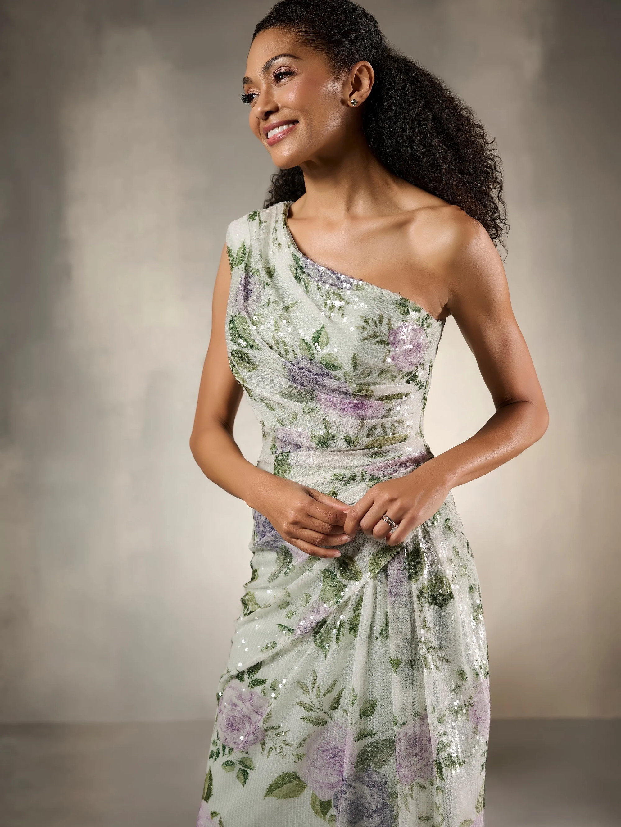 Slim style in sequins lace, with one shoulder and diagonal draping on the bodice, pleating on side front skirt. Sequins Lace