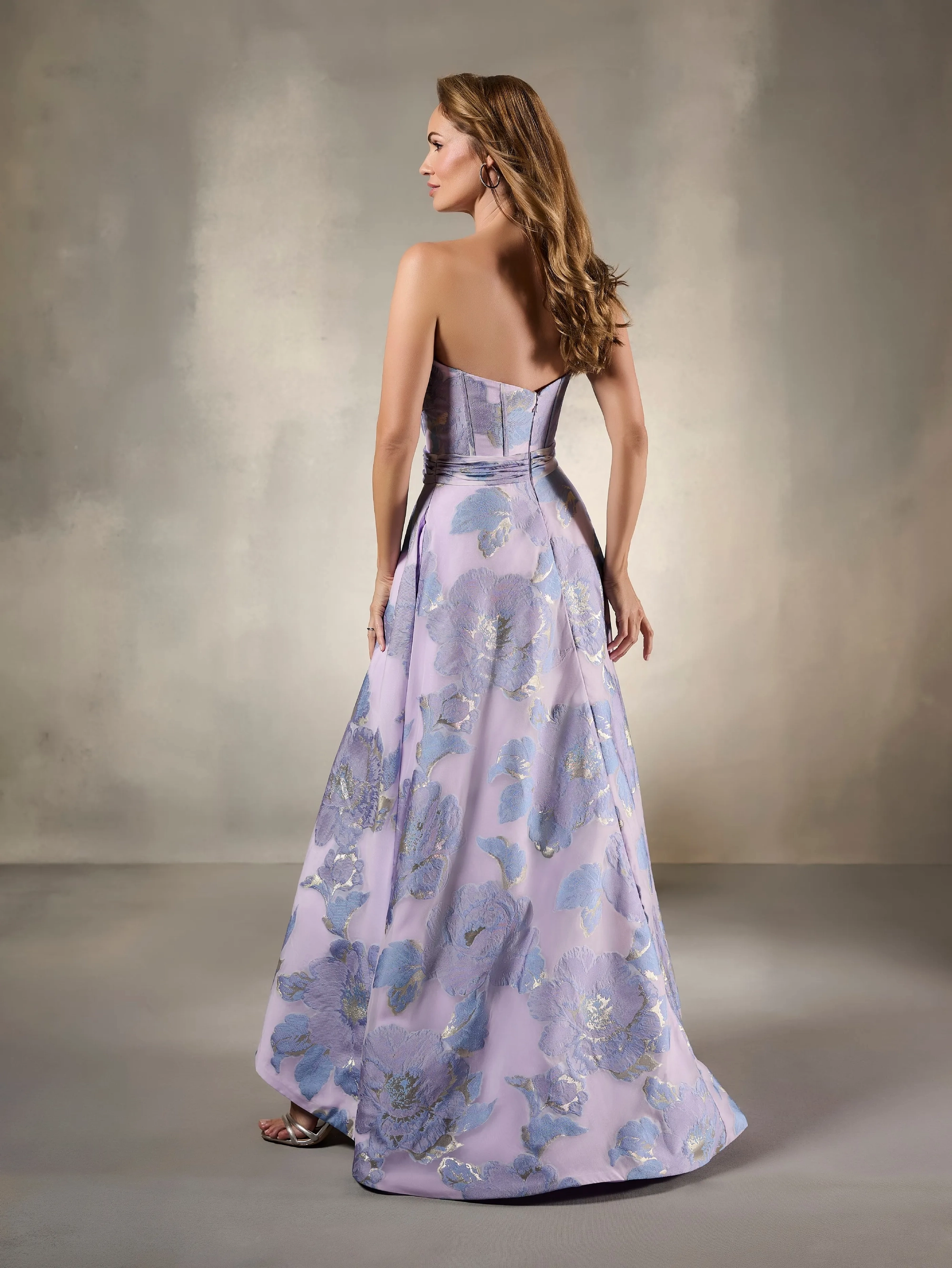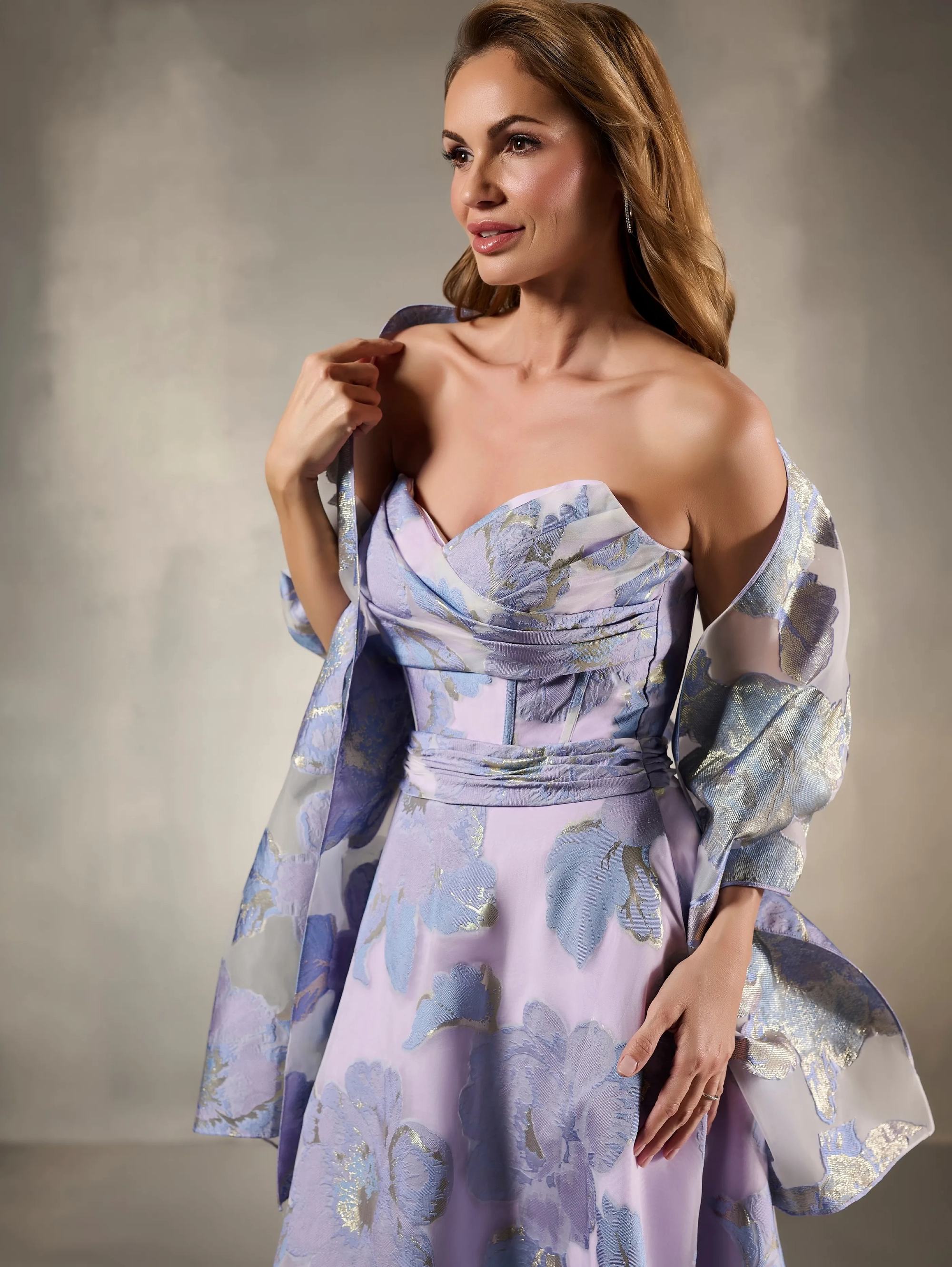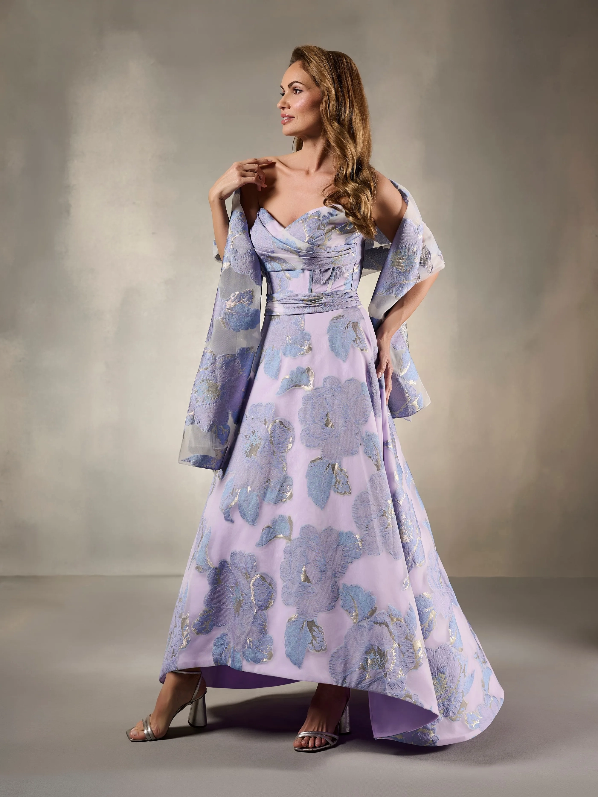 Strapless V-neck metallic organza burnout with corset bodice and removable self shawl. Jacquard