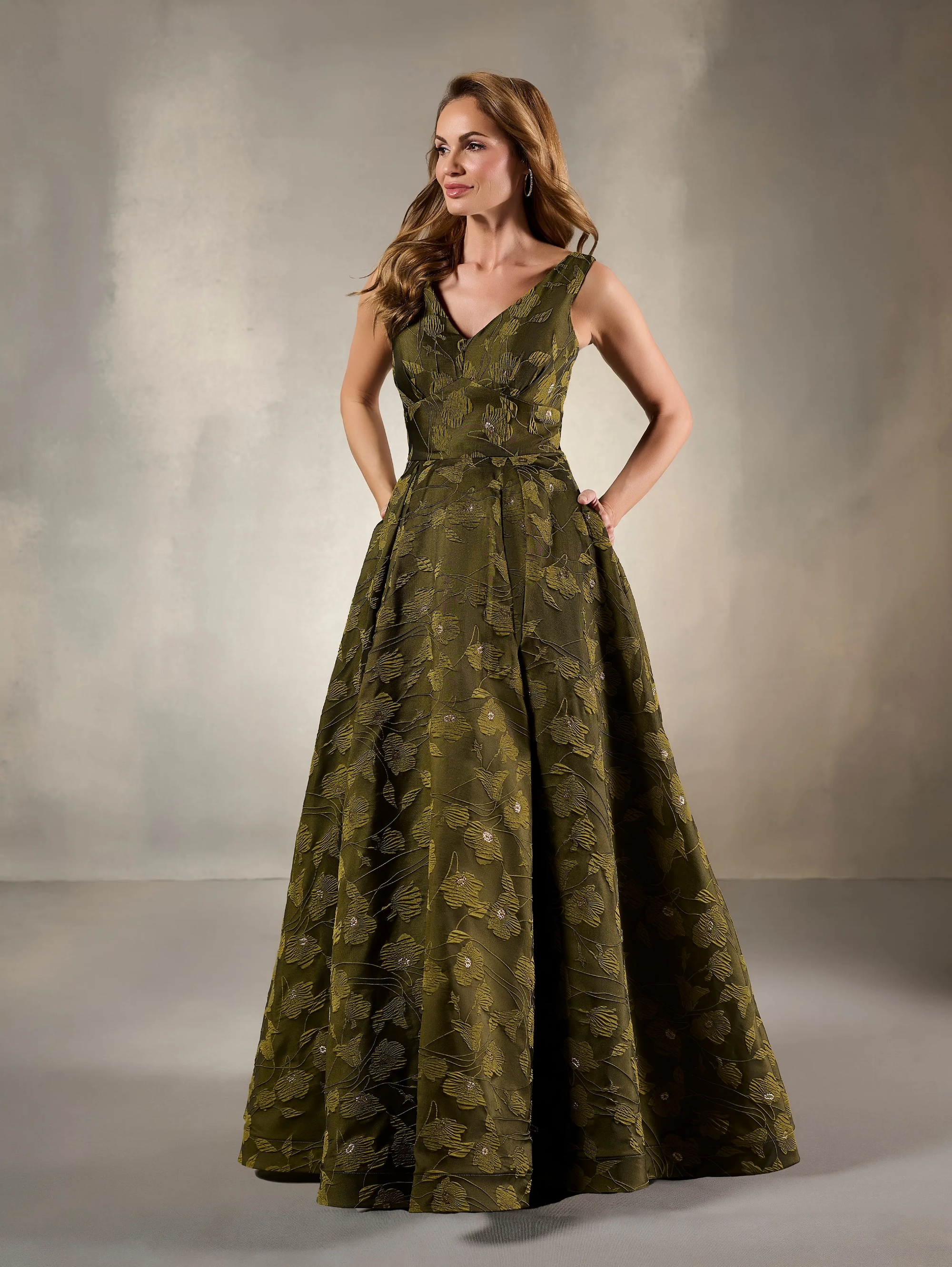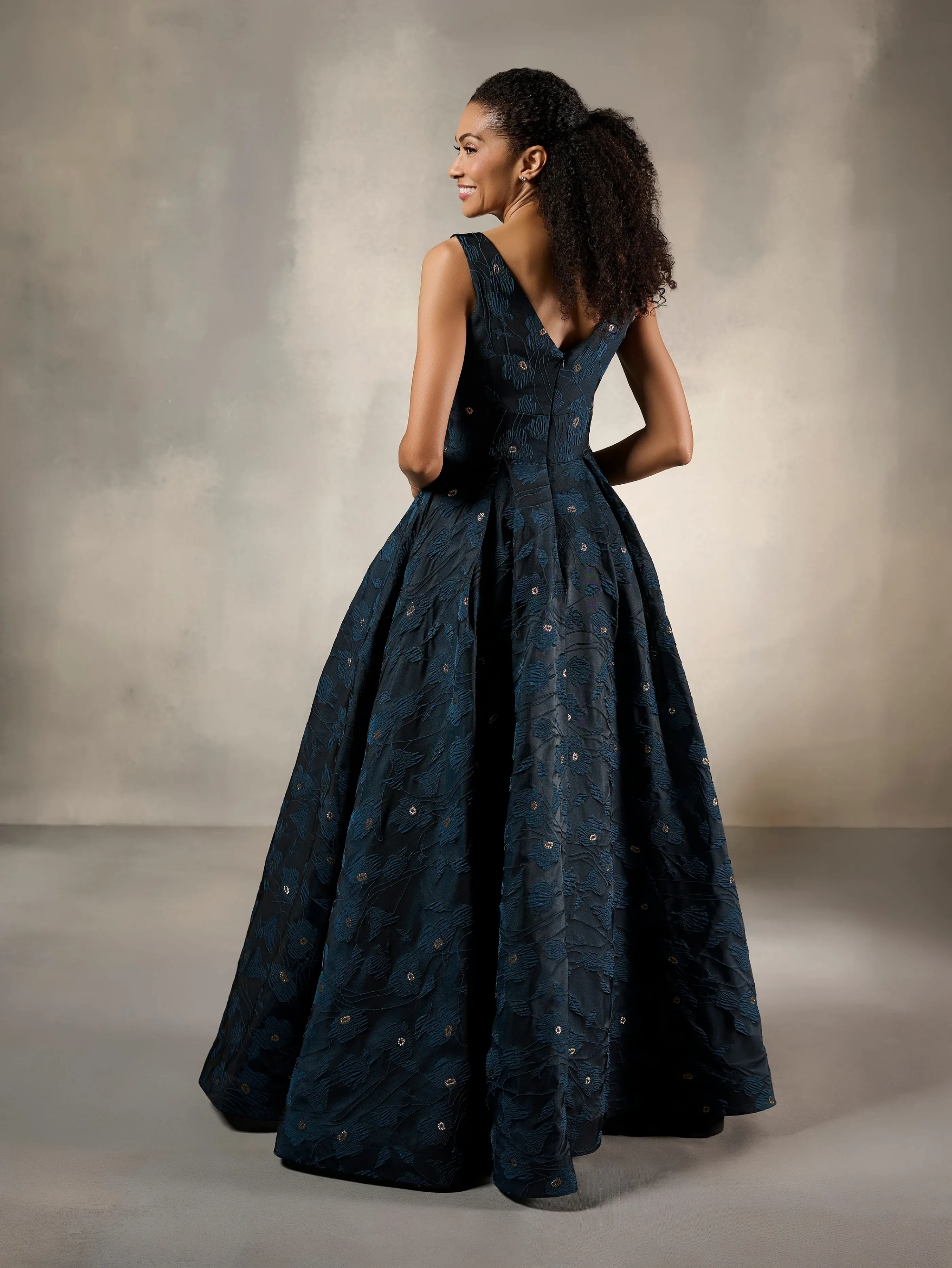 V-neck sleeveless textured metallic floral jacquard ballgown. Textured Metallic Jacquard