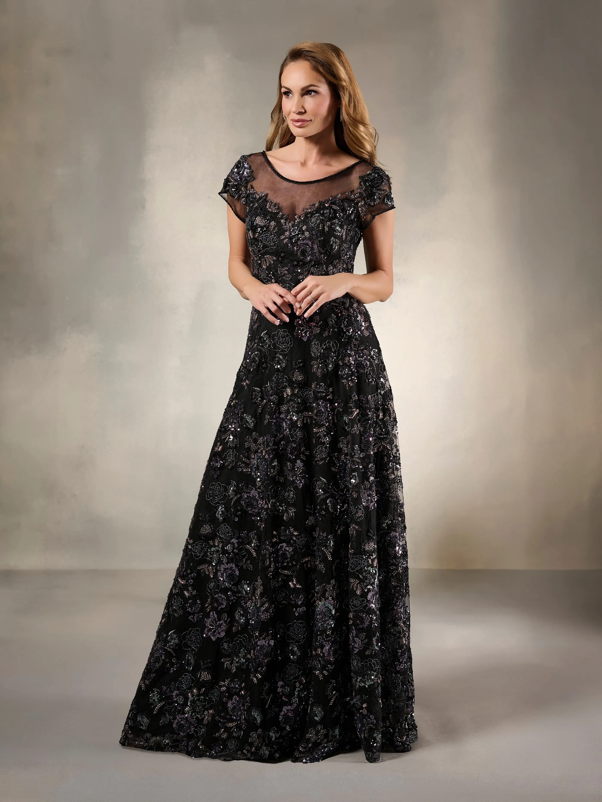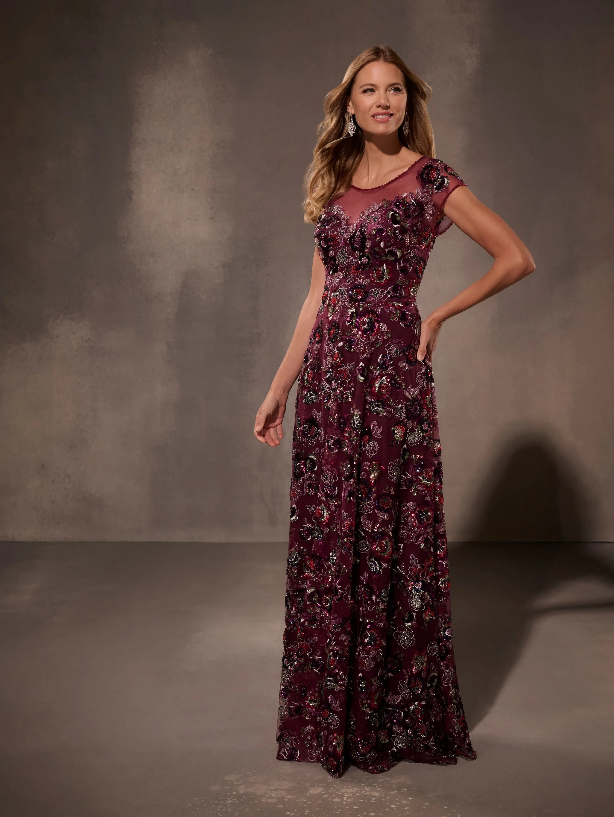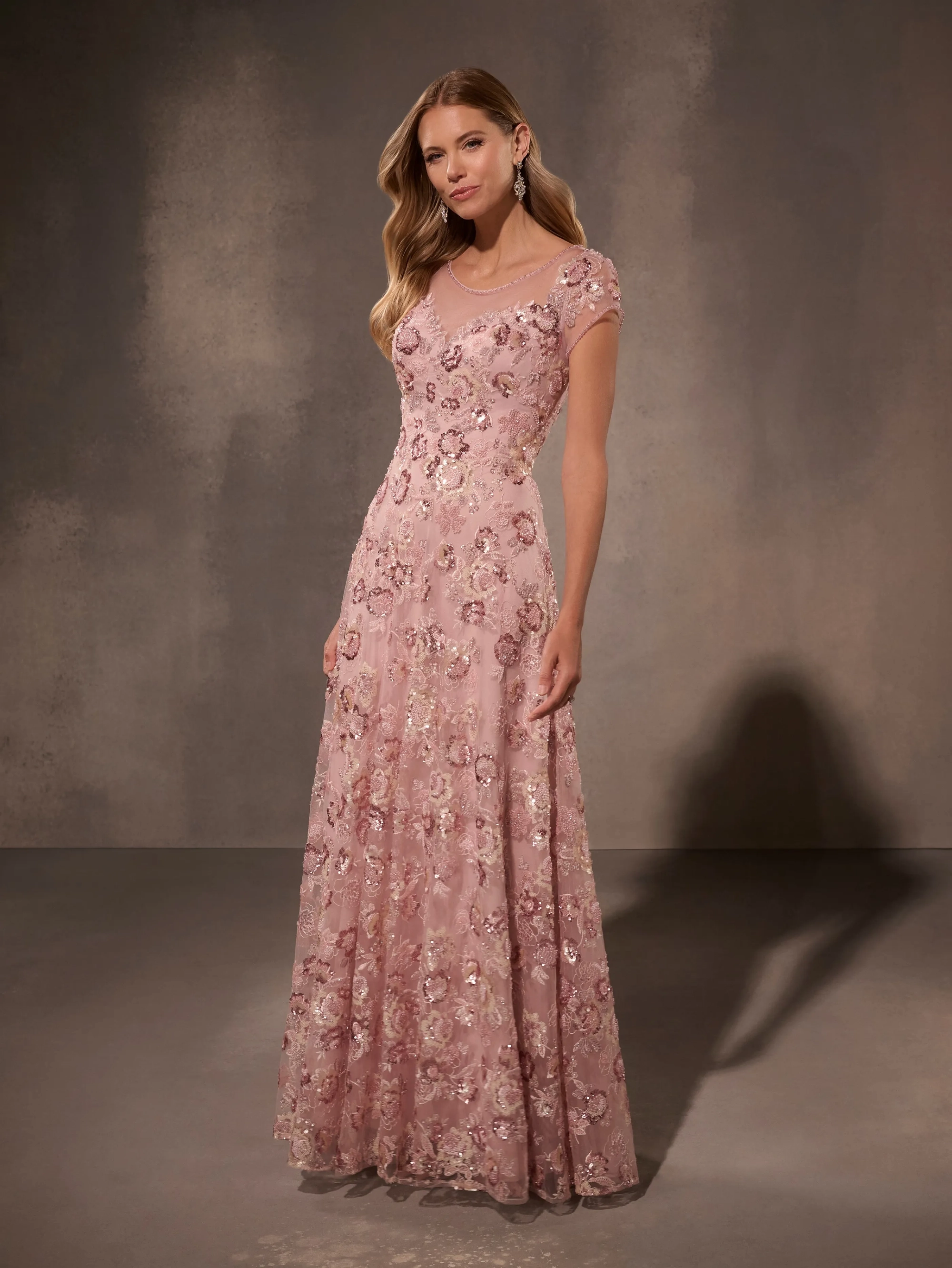 Floral embellished mesh A-line gown with cap sleeves. Floral Embellished Mesh