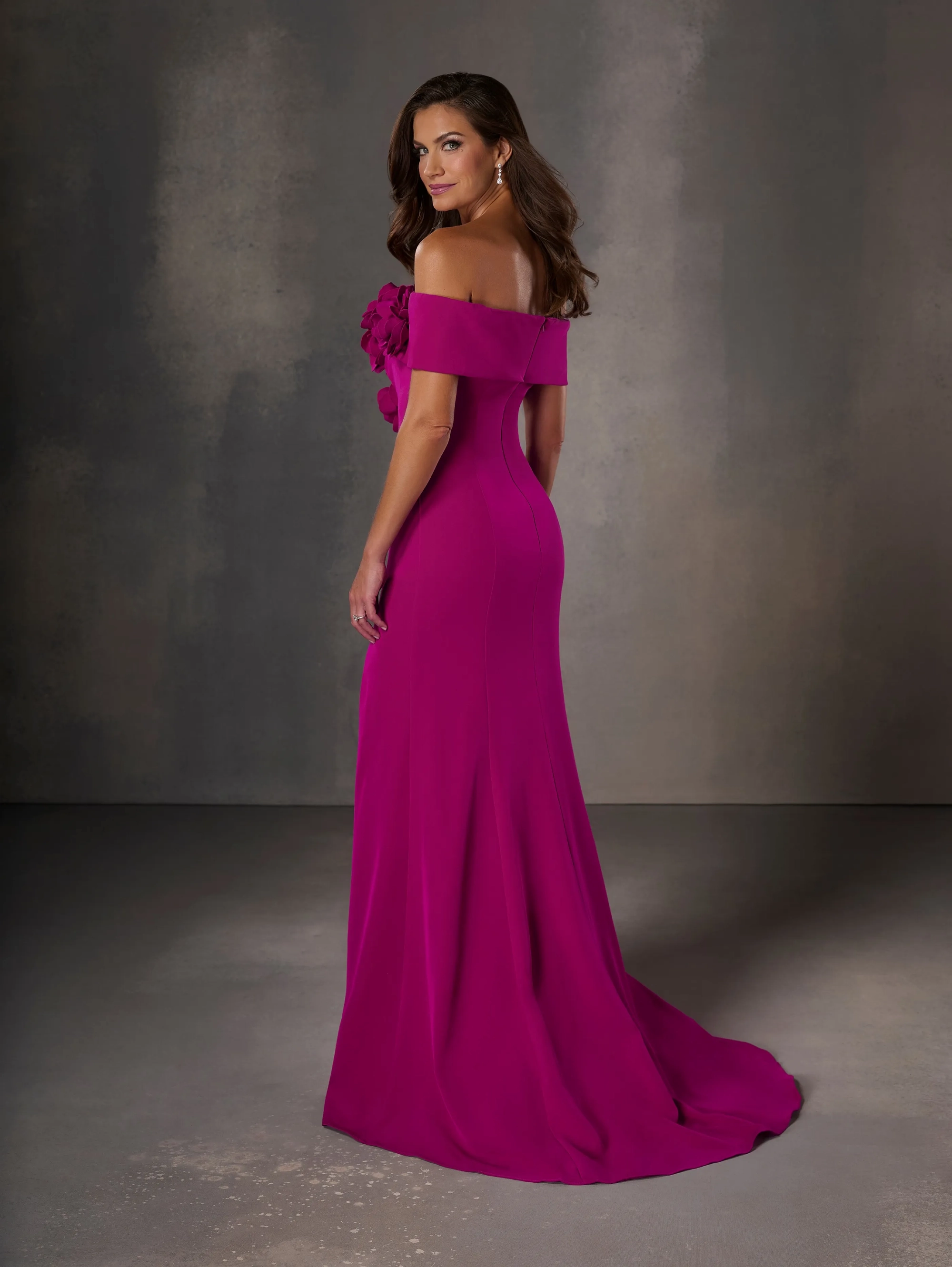 The detailed floral embellishment on this gown beautifully accentuate the off-shoulder bodice. A side split perfectly complements this gown.